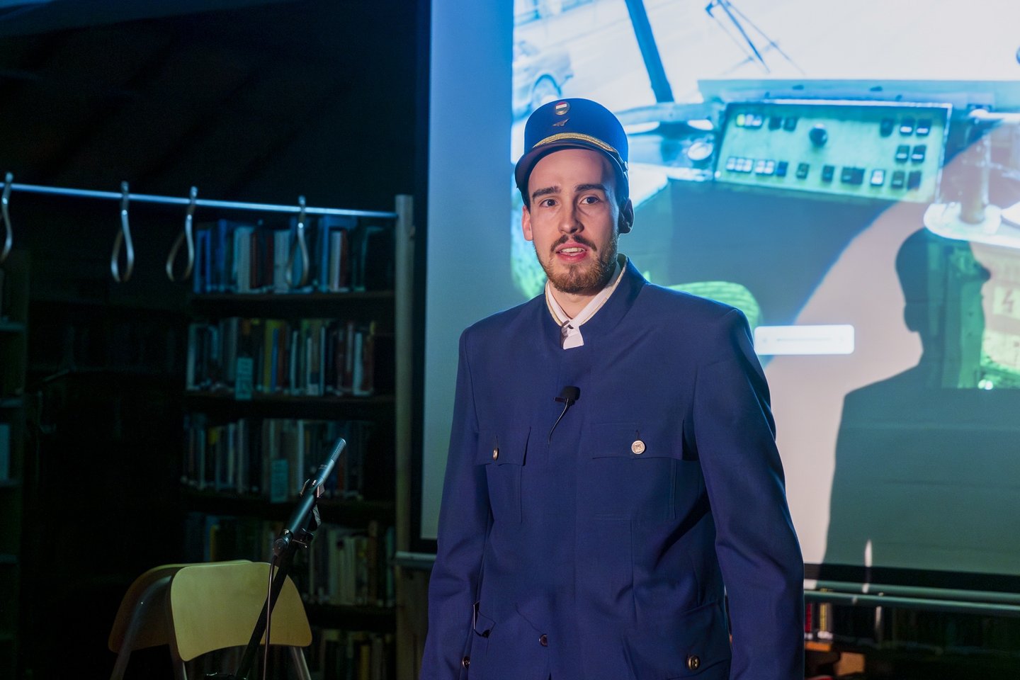 A kalauzt, aki fogadja az utasokat, ellenőrzi a jegyeket, betartatja a szabályokat vagy olykor éppen áthágja őket, ha az számára előnyt hozhat, Szilágyi Sámuel testesíti meg, a szentendrei gyülekezetben szolgáló hatodéves teológus. Az utazás ritmusát a hangulatfestő zene mellett az ő hangja adja, mely minden induláskor és megálláskor jelzi a soron következő állomást.