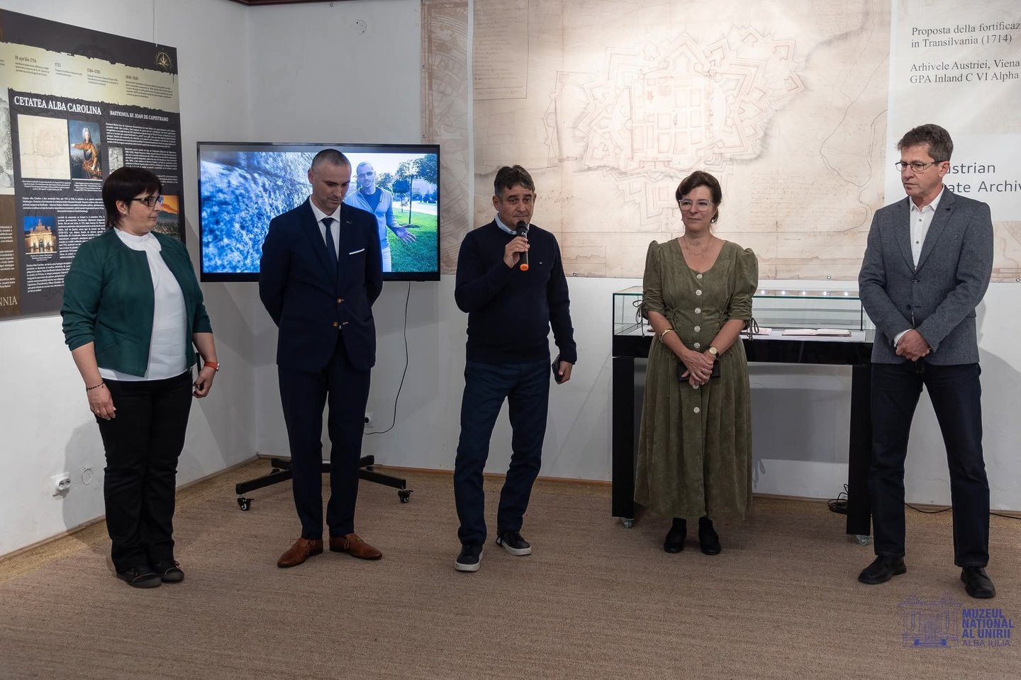 Veres Anna Mária könyvtárigazgató, Florin Bogdan kurátor, Gabriel Codru Plesa polgármester, Berecz Ágnes gyűjteményigazgató, Gabriel Tiberiu Rustoiu főigazgató (az Egyesülés Nemzeti Múzeuma fotója)