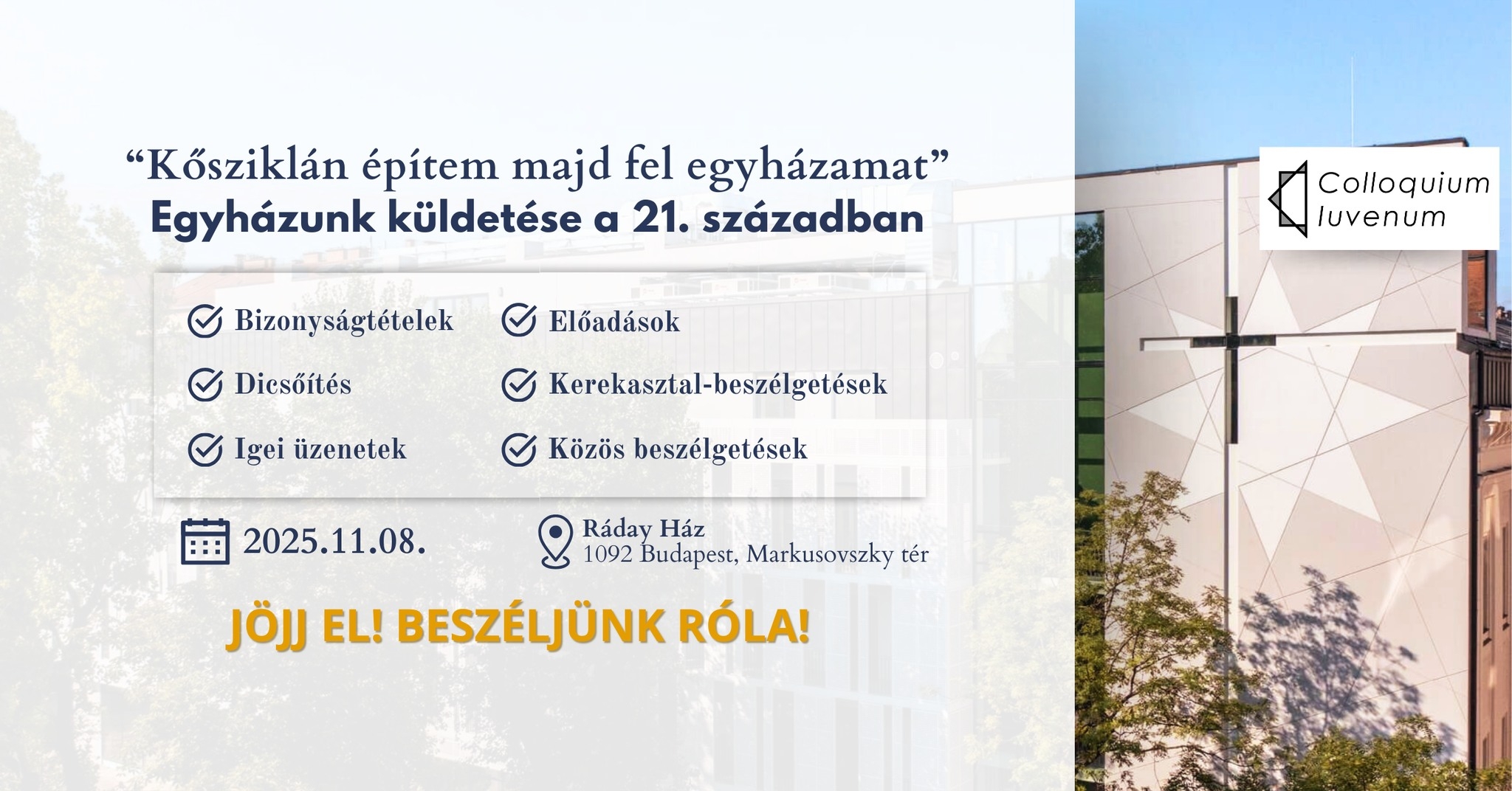 Újabb budapesti rendezvénnyel folytatódik a Colloquium Iuvenum közösség tematikus beszélgetéssorozata: a 2025. november 8. szombati alkalmat a Ráday Házban rendezik meg, ám a korábbi fővárosi disputákkal ellentétben ezúttal egy majdnem egész napos rendezvényre kerül sor „Kősziklán építem majd fel egyházamat” – Egyházunk küldetése a 21. században címmel. A tervek szerint ezen a napon a következő kérdésekre keresnek majd választ: pontosan mi egyházunk valódi küldetése a 21. században, mit jelent ma Krisztusról hitvallást tenni és így „hegyen épült városként” jellé válni, továbbá milyen utak és tévutak állnak előttünk, ha a valódi, hiteles és bátor hitvallástétel útján kívánunk járni mind egyénenként, mind egyházi közösségként.